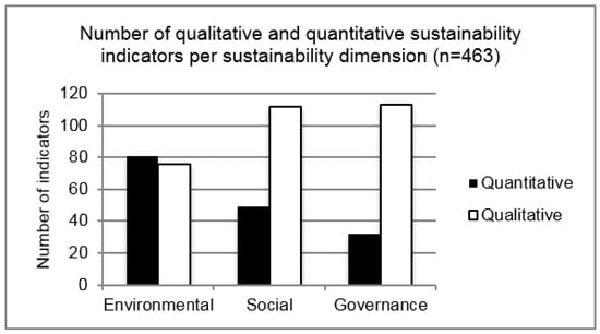Number of qualitative and quantitative indicators used as basis for the indicator developed per sustainability dimension (n = 463).