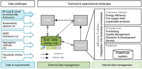 Organizational challenges are linked to all company activities which require and provide information on the different sustainability indicators, such as alignment with company strategies, information collection in different departments, indicator calculation or intra- and inter-organizational communication. Technical challenges occur due to the need for exchanging sustainability information between supply chain partners and are related to aspects of internal and external data management (e.g., integration into existing product lifecycle management (PLM) and product data management systems (PDM)), as briefly outlined in Section 4.3.2 and discussed in more detail by Grambow et al. [61].