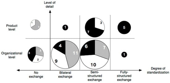 Figure 6 illustrates the results of the analysis. The x-axis refers to the extent to which sustainability data are exchanged along a supply chain as well as to the degree of standardization of such an exchange. The y-axis distinguishes between exchange at the product level and at the organizational level. This is meant to draw attention to the fact that collecting and exchanging sustainability data at the product level may require more information than at the organizational level since the respective sustainability data (e.g., GHG-emissions) have to be allocated additionally to each product separately. As some indicators are exchanged at both the organizational and product level, the overview comprises 74 rather than 69 indicators.