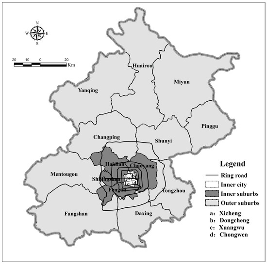 The entire administrative region of Beijing was traditionally divided into three parts: the inner city (four central city districts—Xicheng district, Dongcheng district, Xuanwu district and Chongwen district; in 2010, the four central city districts were reorganised into two new districts, namely new Xicheng district and Dongcheng district); the inner suburbs (including four districts—Haidian district, Chaoyang district, Shijingshan district and Fengtai district); and the outer suburbs (the other eight districts and two counties). The inner city and the inner suburbs together were called the main urban area. The administrative region of Beijing is shown in Figure 1.