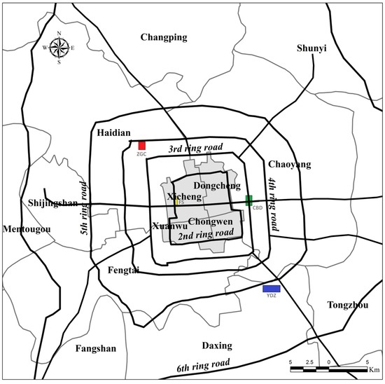 The Central Business District (CBD) is located 5 km east of Beijing’s city centre in the Chaoyang district, an inner suburb district. The CBD is a comparatively newer cluster than the FS, but it is growing very fast as a major agglomeration of varied media, high-end and global-oriented business services and supporting activities [39]. In 2001, the CBD Administrative Commission was established and started to formulate a development plan. The initial site was a 4 km2 block. In 2009, the municipal government decided to extend the CBD eastwards. Presently, the CBD has attracted more than 100 offices of world Fortune 500 businesses in the media, information technology, consulting, financial, and service industries.