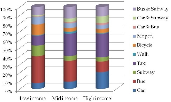 As shown in Table 4, high-income commuters, generally speaking, tended to have a longer average commuting time (36.2 min), while middle-income commuters reported a medium average travel time (32.9 min). Low-income commuters had a shorter average commuting time (30.0 min) than those with high- and middle-income levels. The low-income respondents tended to live in close proximity to their workplaces. This suggests that the recent economic regeneration had barely improved the capability of the poor to reach distant employment opportunities that might provide higher wages. For high-income workers, individual attitudes and preferences may also impact on commuting times. Previous research has indicated that commuting times do not always need to be regarded in a negative manner by all people at all times [44], and this phenomenon may be more obvious in those with high incomes.