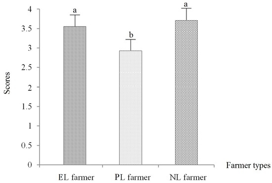 Willingness of different farmer types to participate in the transformation. Notes: 1 = strongly disagree; 2 = disagree; 3 = neither disagree nor agree; 4 = agree; and 5 = strongly agree. Values with different superscript letters in a row indicate significant differences at p < 0.05, and a > b [55,56].