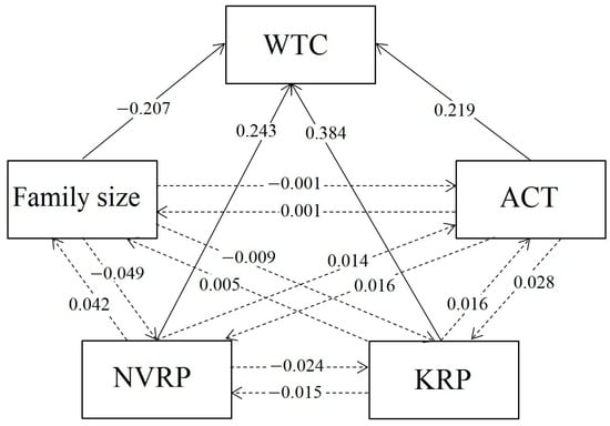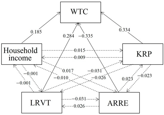 Results of the path analysis of factors affecting the WTC of PL farmers. The solid and dotted arrows denote the direct and indirect effects, respectively.