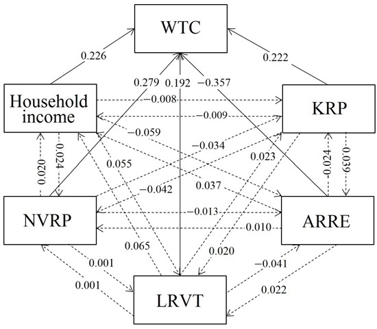 Results of the path analysis of factors affecting the WTC of EL farmers. The solid and dotted arrows denote the direct and indirect effects, respectively.