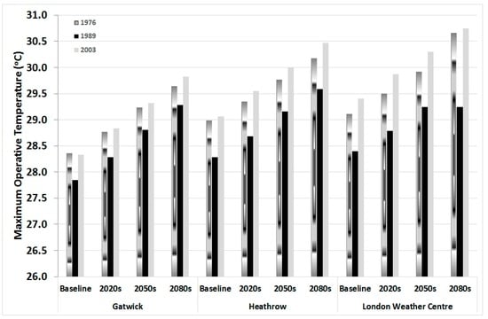 The deterministic analysis results of the UKCP09 Heathrow DSY Medium 50% probabilistic scenarios for 1976, 1989, and 2003 indicated a progressive increase in maximum internal operative temperatures for the 1976 and 2003 years for all timeline scenarios. Gatwick had the lowest maximum operative temperatures, whilst London Weather Centre was observed to have the highest operative temperatures. This affirmed the incorporation of the urban heat island effect of the London Weather Centre weather data sets of CIBSE TM49, as compared with the Heathrow and Gatwick weather files.