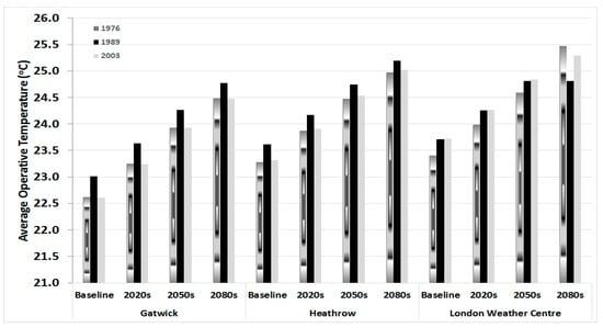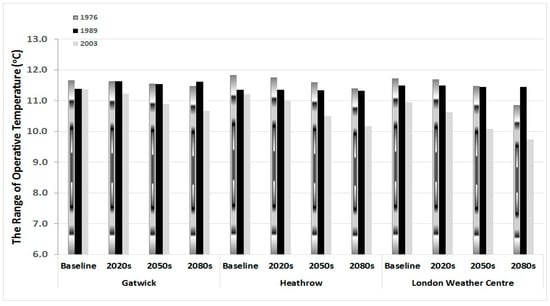 The average operative temperatures for the three locations indicated as expected, with London Weather Centre having the highest average temperatures followed by Heathrow. Gatwick has the least average operative temperatures when compared to the other two locations. The 1989 medium 50% probabilistic weather data set appears to have slightly higher average operative temperatures of about 0.5 °C when compared to all scenarios of the 1976 and 2003 weather data sets. Comparison of the range operative temperatures shows the 2003 medium 50% probabilistic weather data set to have the lowest value when compared to the other years.