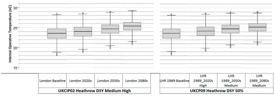 Figure 7 illustrates the box plots comparison of the internal operative temperatures reported in relation to the effect of the design summer year (DSY) medium 50% probabilistic scenarios of the 1976, 1989, and 2003 weather data sets of Gatwick, Heathrow, and London Weather Centre.