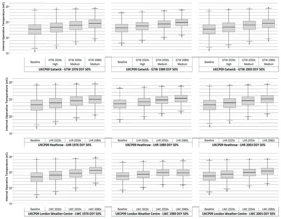 Box and whiskers plot comparison of the internal operative temperatures reported in relation to the effect of the design summer year (DSY) medium 50% probabilistic scenarios of the 1976, 1989, and 2003 weather data sets of Gatwick, Heathrow, and London Weather Centre.