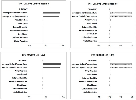 Figure 8 illustrates the comparison of the standardised regression coefficient (SRC) and the partial correlation coefficients (PCC) of the weather input variables for the UKCIP02 Heathrow and UKCP09 1989 Heathrow weather data sets. Figure 9 illustrates the comparison of the standardised regression coefficient (SRC) and the partial correlation coefficients (PCC) of the weather input variables for the UKCP09 1976 Gatwick, Heathrow and London Weather Centre weather data sets.