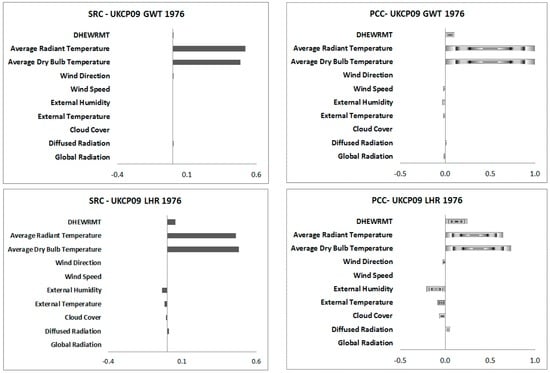 Comparison of the standardised regression coefficient (SRC) and the partial correlation coefficients (PCC) of the weather input variables for the UKCP09 1976 Gatwick, Heathrow and London Weather Centre weather data sets.