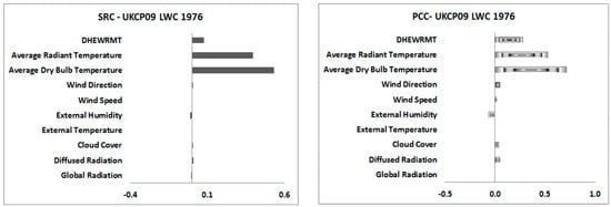 Comparison of the standardised regression coefficient (SRC) and the partial correlation coefficients (PCC) of the weather input variables for the UKCIP02 Heathrow and UKCP09 1989 Heathrow weather data sets.