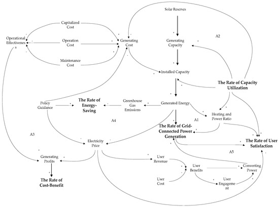 The comprehensive efficiency of distributed photovoltaic relates to the rate of grid-connected power generation, the rate of capacity utilization, the rate of cost–benefit, the rate of energy-saving and emission reduction and the rate of users’ satisfaction. These factors interact with each other to form a cause-and-effect diagram, which reflects the relationships among the elements (Figure 2).