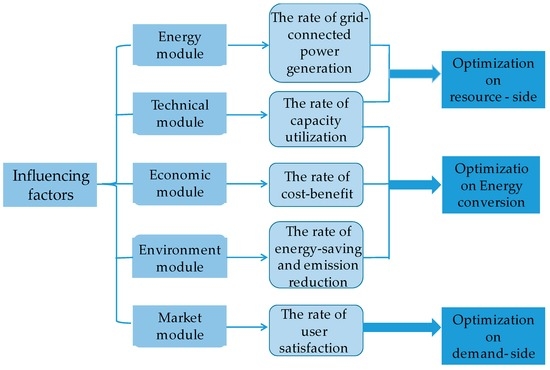 Based on the five influencing factors of the comprehensive efficiency of distributed photovoltaic, the results of efficiency measured equations of all factor modules show (Figure 3) that the improvement of grid-connected efficiency and production efficiency require the optimization of distributed photovoltaic energy resources. The distributed generation capacity will be enhanced on the basis of full utilization of solar energy resources and reasonable planning. The improvement of energy conversion will lead to the promotion of the rate of production utilization, the rate of cost–benefit and the rate of energy-saving and emission reduction, only then can distributed photovoltaic take the technical, economic and environmental benefits into account. As the main market service object of distributed photovoltaic, the rate of users’ satisfaction cannot be separated from the demand side. Therefore, this paper carries on research from three aspects, resource side, energy conversion and demand side, aiming at improving the comprehensive efficiency of distributed photovoltaic in the whole process.