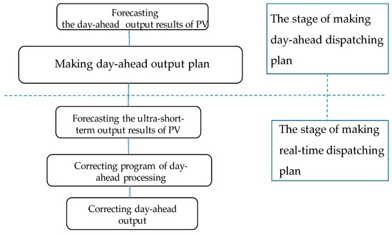 Two-stage dispatching optimization model of distributed photovoltaic is proposed in this paper by taking into account the following factors: energy, economy and environment. The model divides the dispatching program into two stages: day-ahead dispatching and real-time dispatching. The day-ahead dispatching is responsible for generation scheduling. The real-time dispatching corrects the operation mode in the next interval and the day-ahead makes output plan based on forecast results. The entire dispatching process is presented in Figure 5.
