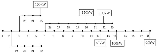 This paper performed simulations using a typical example of IEEE33-node distribution network wiring. Suppose the operation time of the project is 50 years, the maximum annual load loss is 4500 h, the maximum utilization time is 1800 h, and the range of maximum capacity of each node is 50–150 kW. The electricity price of power distribution is 0.7 Yuan/kWh, and the operation cost is 0.72 Yuan/kWh. Photovoltaic power generation is 10,000 Yuan/kW, which is equivalent to the annual construction costs 200 Yuan per kW. Over the same period, coal-fired power plant emits 950 g CO2 when it generates one kilowatt electricity energy.