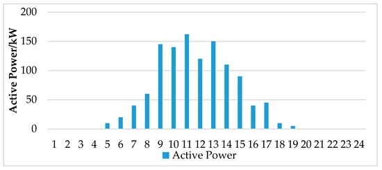 The figure of photovoltaic active power forecast shows the power trend of photovoltaic devices within 24 h. As can be seen in Figure 8, the distributed photovoltaic system has output during 5:00 a.m.–20:00 p.m. and the output between 9:00 a.m. and 14:00 p.m. was above 100 kW which was the peak period. Arranging the output of photovoltaic power generation on the basis of forecast will reduce the influence of uncertain factors on the level and capacity of system generation, which provides effective support for revising the previous generation output and making the plan of day-ahead output dispatching.