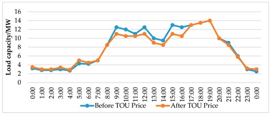 Changes of total load before and after the implementation of TOU price policy can be obtained by analyzing the existing data and Equations (15)–(17). Figure 9 shows the results.