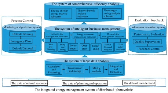 Integrated energy management system takes electricity demand, energy supply, energy conversion and storage into account and integrates infrastructure of renewable energy sources [15,16]. Energy management system improves the availability and security of the system itself with optimized utilization efficiency of renewable energy sources and solutions to electricity defects, and strives to maximize efficiency and optimize environmental costs [17,18]. Energy management systems play an active role in energy investment, use and maintenance of equipment, energy transportation and other stages. The effective method to deal with problems of distributed photovoltaic is to improve the utilization efficiency of energy on the basis of rational layout and optimized facility allocation and management function in an economical and environmental way. Therefore, the application of energy management system plays a critical part in optimizing comprehensive efficiency of distributed photovoltaic.