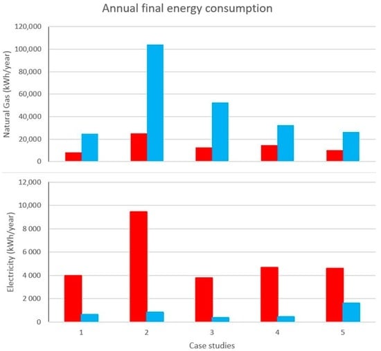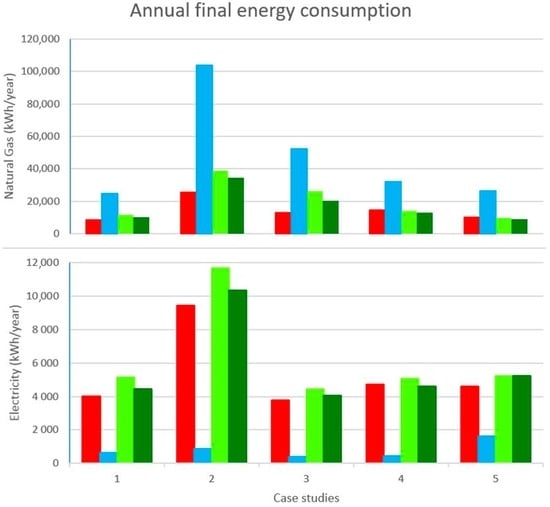 Comparison of annual final energy consumption data for the 5 case studies: natural gas (first graph) and electricity (second graph). In red: real data given by respondents; in blue: EPC regulatory results; in green: revaluation of final energy consumptions (light green for the EPB average climate, darker for the “real” climatic data). Numerical values can be found in Table 7.