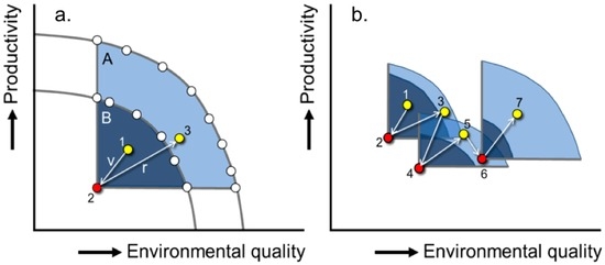 Figure 1. Portions of solution spaces with future options that perform better for two generic objectives, productivity and environmental quality, relative to disturbed states denoted by red symbols. (a) After a disturbance, the system states change following the arrow from Point 1 to Point 2 (vulnerability v is the distance between points 1 and 2), and move to a more desirable state such as Point 3 (resilience r is the distance between points 2 and 3). Area A represents the adaptive capacity and B the buffer capacity of the system after the disturbance. Potential P is calculated are the sum of areas A and B. White symbols denote alternatives for the current system; (b) The potential of a system at consecutive moments in time, with changing attained states (points 1, 3, 5, and 7) and after disturbances (points 2, 4, and 6).
