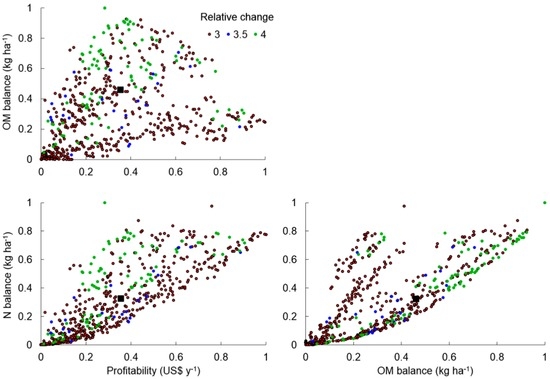 The relation between the attainable improvement in the objectives and the required adjustments in farm management is illustrated for farm SS in Figure 3. To enable comparability among objectives, the objective values were normalized. As shown by the color-coded values of the relative change index (calculated as the sum of squared normalized change in the decision variables, Equation (1)), the largest adjustments in management were required to increase the organic matter balance (Figure 3).