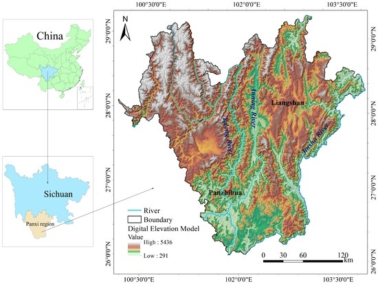 The Panxi region is located in southwest of Sichuan Province, China (Figure 1; 100°15′E to 103°53′E, 26°13′N to 29°27′N). Covering 67,500 km2 in area, it includes the city of Panzhihua and the Liangshan Yi Autonomous Prefecture. It borders the Tibetan Plateau to the north, the Yunnan-Guizhou Plateau to the south and the Sichuan Basin to the east. There are a variety of landforms, with mountains and hills predominating [41]. The terrain is higher in the northwest, and it is lower in the southeast; and deep river valleys are typical of the region, which has altitudes ranging between 291 and 5436 m. It has abundant water sources, including the Jinsha, Yanlong and Anning Rivers, among other branches of the Yangtze River. Meanwhile, with abundant mining resources, the Panxi region is one of China’s most important mining belts [42]. With the acceleration of urbanization and industrialization, demand for built-up land is rising, which has increased its encroachment on farmland. Moreover, economic development in the rural areas of Panxi is lagging behind the national average, and the production mode is extensive, so there are a series of inappropriate human activities occurring, such as deforestation and cultivation of marginal slope areas [43]. Consequently, the natural environment faces serious problems. In order to restore the natural environment, the Chinese Government conducted a pilot project in Sichuan Province in 1999 that investigated the return of farmland to forest and grassland. It advocated putting a halt to the development of land in slope areas that can potentially lead to soil erosion and to restore forests in suitable places so as to protect and enhance the regional environment.