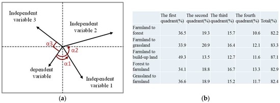 Principal components analysis (PCA) is a mathematical algorithm that reduces the dimensionality of data while retaining most of the variation in the dataset, which is the most widely used function. At the same time, PCA can also be used to study the correlation between the independent variable and the dependent variable, which is the purpose of this paper. Within the PCA sequencing diagram, if the angle between the independent variable and the dependent variable is smaller, their correlation is higher; on the contrary, their correlation is smaller. Additionally, their correlation size can be calculated through the formula of cosα. As shown in Figure 2a, the angle between the dependent variable and Independent Variable 1 is less than 90 degrees, namely cosα > 0, which means that their correlation is positive; the angle between the dependent variable and Independent Variable 2 is more than 90 degrees, namely cosα < 0, which means their correlation is negative; the angle between the dependent variable and Independent Variable 3 is 90 degrees, namely cosα = 0, which means they are not related. Before the correlation judgment, we should analyze the explanation degree of the independent variable to the dependent variable in each quadrant. Starting from the top right corner, each square is named as the first quadrant, the second quadrant, the third quadrant and the fourth quadrant in the counterclockwise direction. It is shown in Figure 2b that the explanation degree of the independent variable to the dependent variable is different in each quadrant, but their total explanation degree is over 80%. Therefore, we can conduct further analysis. All of these can be completed through CANOCO 4.5 software [48].