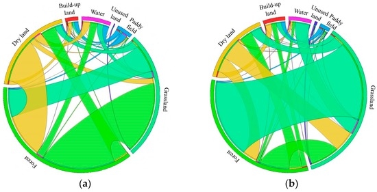 This study investigated two periods of farmland changes. The chord diagram (Figure 4a) indicates that from 1990 to 2000, farmland was converted mostly from forest and grassland, which contributed 58.6% and 26.8% of the roll-in area of farmland, respectively. During the same period, some farmland was converted into forest land and water resources, with net transfer areas of 88.72 and 37.04 km2, respectively. This is because, in order to develop agriculture, Panxi region undertook many water conservancy projects. To improve water resource allocation capacity and save transportation costs, these projects were mainly built between farmlands and occupied some part of them. Moreover, Panxi region is a typically poor area, many rural youth chose to work outside in order to make much more money, which left the older people and children in the countryside. Because of the restriction of health, the older people could not engage in agricultural production activities, which need good physical strength. Therefore, a large amount of farmland became idle. Later, with the drive of protecting the environment, the government encouraged the older people to begin to plant trees in the idle land and gave them economic compensation, which promoted the transfer from farmland to forest. The chord diagram (Figure 4b) shows that from 2000 to 2010, some farmland was generated from forest and grassland, but farmland was mainly turned into grassland and built-up land, with net transfer areas of 76.22 and 74.74 km2, respectively. This is because Sichuan Province strived to develop a policy of Returning Farmland to Forest and Grassland and replace unsuitable farmland with grass and trees, which accelerated the transformation of farmland to grassland. Meanwhile, the urbanization of China increased in the new millennium. As a result, a rising urban population and industrialization have intensified the demand for built-up land. Hence, farmland around the cities became increasingly occupied, and built-up land areas increased significantly.