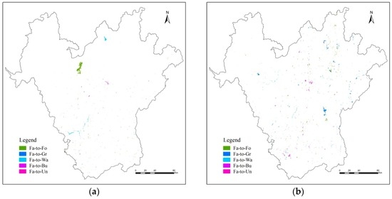 Spatial distribution of farmland converted to other land use types, Panxi region: (a) 1990 to 2000; (b) 2000 to 2010. Farmland to forest (Fa-to-Fo); farmland to grassland (Fa-to-Gr); farmland to water (Fa-to-Wa); farmland to built-up land (Fa-to-Bu); and farmland to unused land (Fa-to-Un).