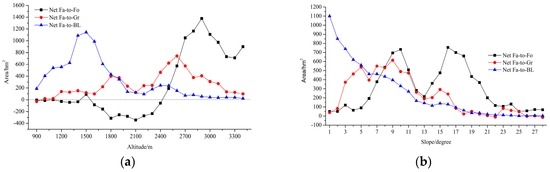 As indicated in Figure 6a, there are significant differences in the net transformation characteristics of farmland to forest, grassland and built-up land. The net transfer area of farmland to built-up land (net Fa-to-BL) was larger than zero, showing a sharp rise and a fluctuating descending tendency. When altitude reached 1500 m, net Fa-to-BL reached its maximum. Net transformation area from farmland to grassland (net Fa-to-Gr) was also larger than zero, showing a fluctuating-rising and sharp-declining tendency. When the altitude reached 2600 m, net Fa-to-Gr reached its maximum value. Net transformation area of farmland to forest (net Fa-to-Fo) turned from negative to positive. When the altitude was <2500 m, net Fa-to-Fo was smaller than zero. This was manifested as forest transferring to farmland. When the altitude was >2500 m, net Fa-to-Fo was larger than zero, manifested as farmland being transferred to forest. Therefore, 2500 m can be regarded as the boundary point for the transformation between farmland and forest. As indicated from Figure 6b, net Fa-to-BL, net Fa-to-Gr and net Fa-to-Fo at different slopes were all larger than zero, indicating that farmland was transferred to other types of land. Among these, the transformation range from farmland to built-up land decreased at a faster pace in regions with less slope, and the fluctuations of net Fa-to-Gr and net Fa-to-Fo were larger. Meanwhile, when the slope was <7°, net Fa-to-BL was higher than that of grassland and forest. When the slope was >7°, net Fa-to-BL was lower than that of grassland and forest.