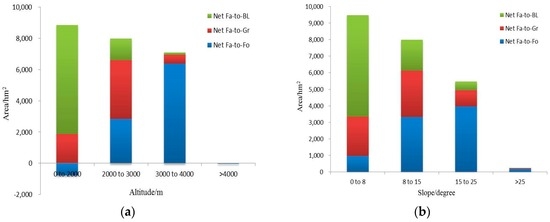 At the same time, with increasing altitude and slope, the net transformation area of farmland gradually declined (Figure 7a,b). Within this, net Fa-to-BL declined, while Fa-to-Fo increased, and Fa-to-Gr had a fluctuating tendency. At different altitudes or slopes, net farmland transformation direction varied. To be specific, low altitude or slope zones had the largest net Fa-to-BL. At middle altitude or slope zones, Fa-to-Gr was largest. Above middle altitude or slope zones, Fa-to-Fo was largest. Interestingly, at low altitude zones, net Fa-to-Fo was negative as forest was transferred to farmland due to agricultural development. Over time, due to the exploitation of forests and land reclamation, several ecological issues, such as land and soil erosion and desertification, arose. In order to ease these conflicts, Sichuan Province implemented a policy of Returning Farmland to Forest and Grassland in 1999. This included any farmland with slopes >15°. Net Fa-to-Fo has mainly occurred at slopes >15°, which demonstrates that the project of returning farmland to forest in Panxi has had considerable success.