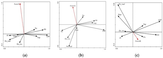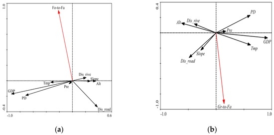 It can be seen from Figure 9 that the conversion of other land types to farmland was positively related with Tmp. The conversion of other land types to farmland was negatively related with PD and Alt, while other factors were significantly different due to the land types that were transferred to farmland. With rising temperatures, conditions become more favorable for crop growth, accelerating land exploitation and utilization. As the crucial agricultural production zone in Sichuan Province, the Ganre River valley increased its utilization of the land by making use of the advantageous light and heat conditions.