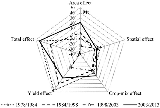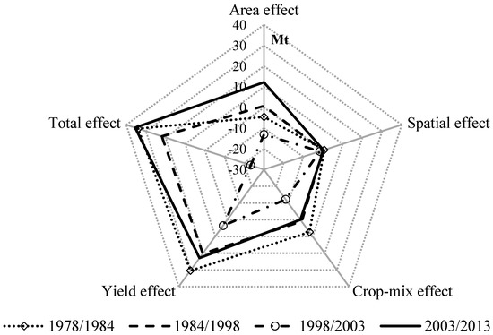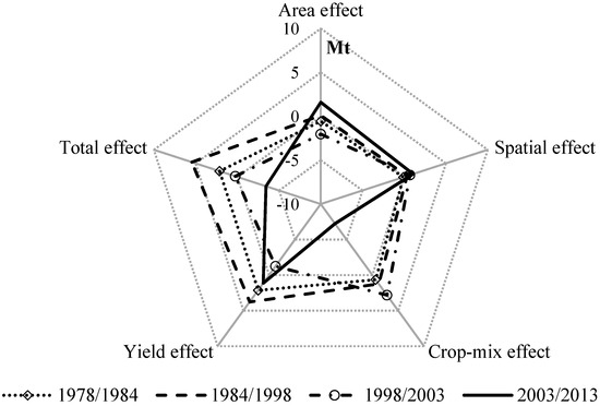 | Periods | Area Effect | Spatial Effect | Crop-Mix Effect | Yield Effect | Total Change | |||||