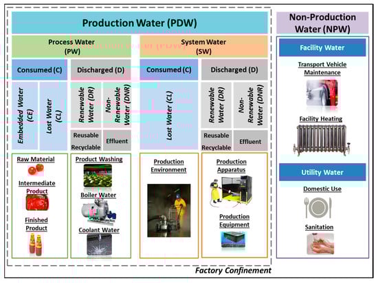 Each CL, DR, and DNR flow can be categorized as process water (PW) or system water (SW). PW is defined as the water used in production processes that is essential to convert raw materials into intermediate and final products—for example, water used as an ingredient in products, as a solvent, as a coolant or lubricant, or as a cleaning agent to wash products. SW is defined as the water used in the production processes to maintain the production equipment, apparatus, and environment—for example, water used in clean-in-place (CIP) systems or other general cleaning activities to sanitize production equipment and material-handling systems. CE flows are PW by definition. The concept of process and non-process beneficial depleted water flows proposed by Molden and Sakthivadivel [50] for water basins is similar, as for these authors the non-process flow produces value but is not consumed directly by the process in question.