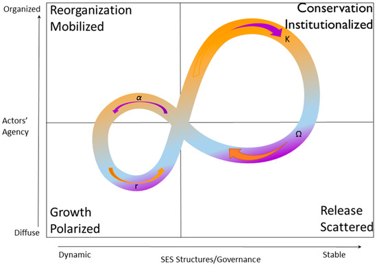 Application of the adaptive cycle to urban socioecological systems; Source: based on Pelling and Navarrete [69]; Graphic design by Karen Griggs.