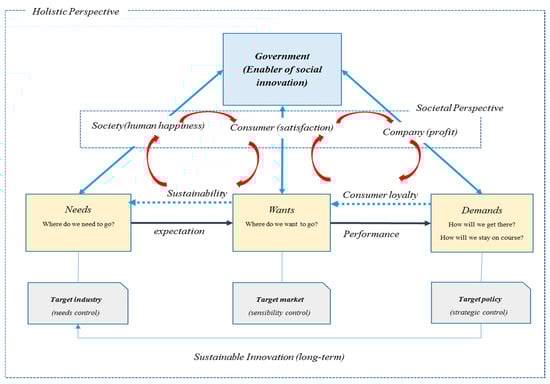 In this model, we assumed that the core value is consumer needs, which are embodied in wants and demands. By adjusting government policies, both consumer satisfaction and human happiness (well-being) can be maximized at each stage (Figure 1). The best performance of this model is observed when there is prolonged customer loyalty and sustainability in the market.