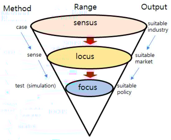 A new marketing model provides a three-dimensional conceptual space for holistic and social perspective comprising the dimensions of sensus, locus, and focus [4]. In this paper, sensus is a compound word of sense and focus. We uncover cases to determine the industry, find the market in the industry by exploring the sense, and then go through the process of testing the new policy in that market (Figure 2).