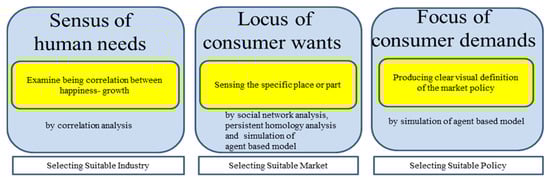 Section 4.1 examines the sensus of human needs, which is the industry setting that best fits the people of the country. Here, Korea is taken as an example. Section 4.2 examines the locus of human wants, sensing the specific place or part in the sensus by social network analysis, persistent homology analysis, and simulation of an agent-based model [4]. Section 4.3 examines the focus of demands, meaning the state or quality of having or producing a clear visual definition of market policy by simulation of an agent-based model.