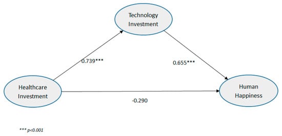 In Table 4, all the direct relationships postulated in this analysis were found to be positive and significant (at a 0.001 level of significance), except the hypothesis that proposed a positive influence of healthcare investment on human happiness, which was found to be insignificant.