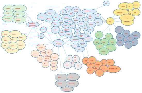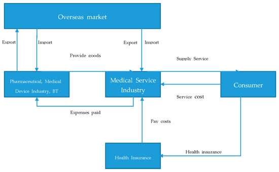 As described above, we found the following five of 12 major topics through hysteresis analysis: new drug infrastructure, healthcare development, pharmaceutical investment, R&D investment, and expanding commercialization. By analyzing the common areas of these five topics, we selected the pharmaceutical market for our target market. As shown in Figure 14, the pharmaceutical market plays an important role in R&D, commercialization, and infrastructure of healthcare systems in South Korea.