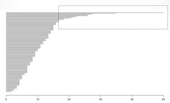 We first performed a persistent homology analysis to determine the number of clusters. The reason for this analysis is that there is no objective criterion for how many clusters should be set in the cluster analysis. The notion of “persistent homology” is the algorithms for topological invariants across various scales of a topological manifold in TDA (Topology Data Analysis) [11]. A “barcode” plot is a qualitative visualization of a homology group. The x-axis in Figure 7 represents the scale parameter “e” and the y-axis is an arbitrary ordering of homology generators. In Figure 7, the straight line that survives to the end is meaningful even though the y-axis increases clockwise, while short lines are just topological noise [12]. The number of meaningful long lines is 12. This is because we have to choose the place where the gap between lines is the largest (Figure 7).