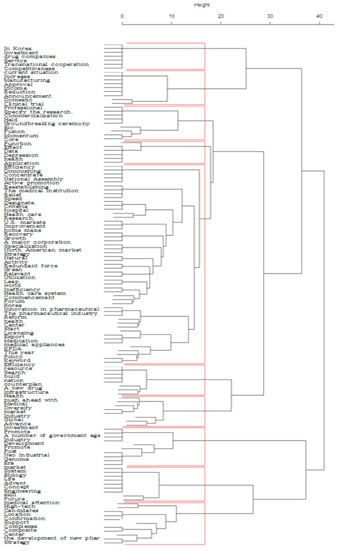 Here, we can see 12 of the main topics in these word clusters. The vertical distance represents the degree to which semantic relationships were included. The co-occurrence words-based, social network analysis is one of the simplest topic models and, as such, is very widely used. The model is considered psychological, which means such models represent a sort of social perspective (Figure 8).