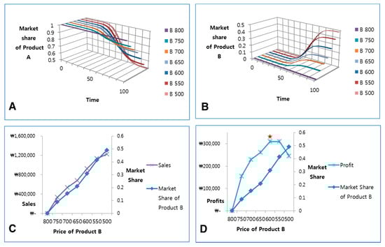 Changes of market share of Product A (A) and Product B (B) according to the price changes of Product B (low-price product, which entered market). Changes of market share, sales (C), and profits (D) of Product B in several conditions of Product B.