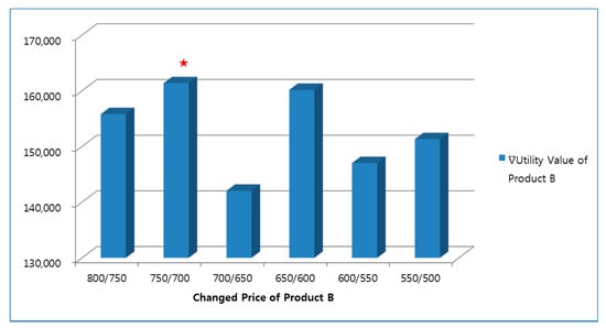 We next looked at the effect of introducing a pricing policy that supported the national welfare of elderly people through access to effective, affordable medications. The highest utility value was demonstrated when the price was dropped (with support from the budget) from 750 to 700 won (Figure 17). As such, 700 won is considered the optimal price point. By using this method of evaluation, the second optimal price point was determined to be 600 won. When the price of Product B was changed by policy within a society, the changes in utility values for Product B were calculated as follows: