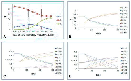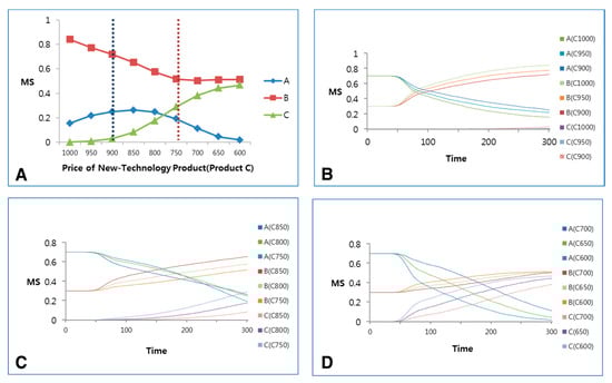 Changes of market share of Product A, Product B, and Product C according to the price changes of Product C (new-technology product, which entered market) (A). Changes of market share when the price of Product C is greater than 900 won (B); when the price of Product C is between 750 and 850 won (C); and when the price of Product C is 700 won or less (D).