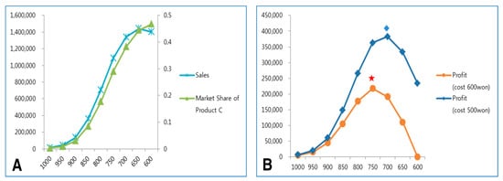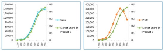 Changes of market share, sales (A), and profits (B) of Product C according to the price changes of Product C.