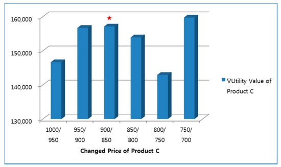 Furthermore, if there is support for the price of the new-technology product, the optimal point for cost-effectiveness is 850 won (Figure 20). When the price of Product C was changed by a policy that focused on welfare or on the development of new technologies in society, the changes in utility values were calculated as follows: