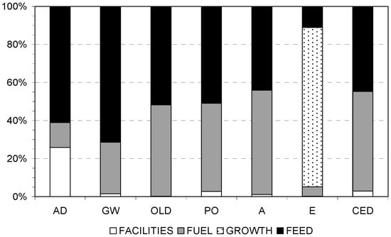 | Input FEED (RAW MATERIALS, 1 t feed (kg·t−1 feed) FCR: 2 | Output FUEL (kg·t−1); emissions to air; emissions factors [51] | ||