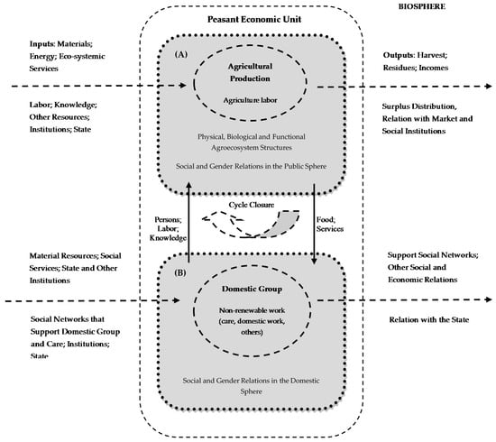 The indicators’ proposal has been designed for the analysis of the peasant economic unit (PEU) or domestic group as the basic system for understanding family agriculture. As shown in Figure 1, the PEU consists of two clearly interrelated spheres or spaces. Even though sustainability assessment methodologies usually focus on socioeconomic and environmental interrelations within the agricultural sphere (A), these must be understood in interdependence with the relations developed within the domestic sphere (B). Analyzing the socioeconomic relations of the domestic group is essential in order to determine the degree of sustainability of the PEU as a whole.